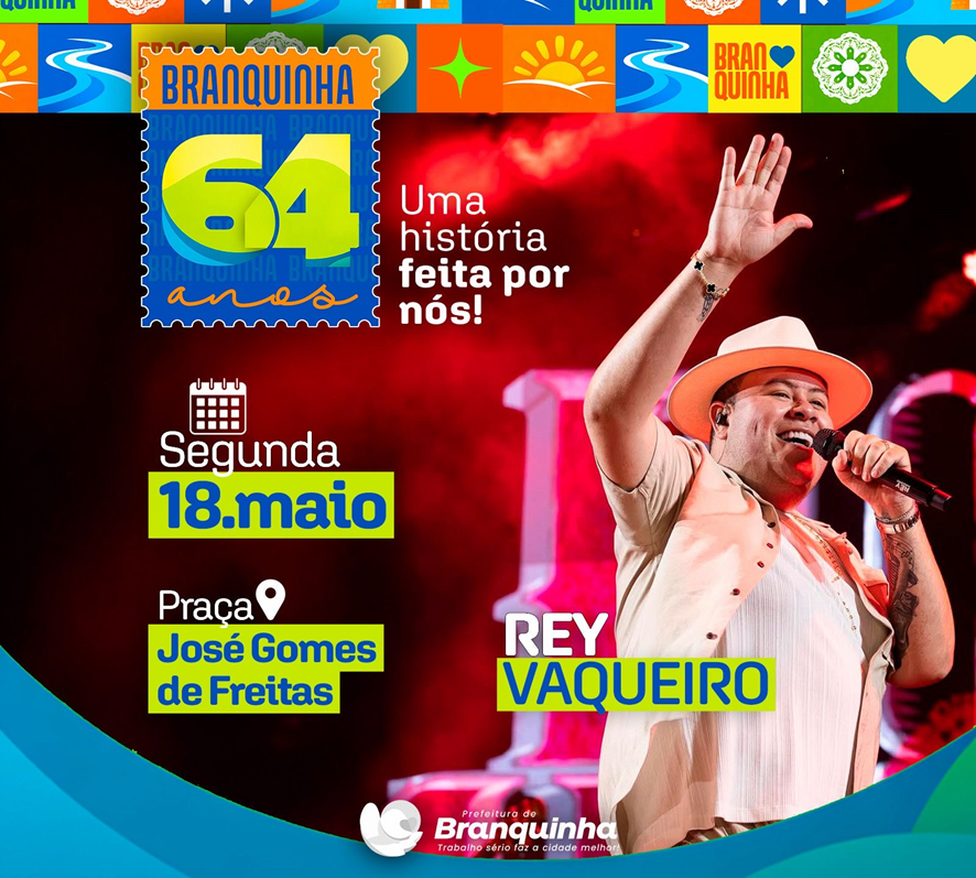 Celebrando 64 anos de história no próximo mês de maio, a prefeitura de Branquinha acaba de anunciar a primeira atração da grade artística do dia 18: o cantor Rey Vaqueiro. Com um forró diferenciado e dono de um repertório cheio de hits como “Body Splash”, “Estrela”, “Bem-vinda ao Meu Mundo”, entre outros, o cantor promete colocar todo mundo para dançar na Praça José Gomes de Freitas – centro da cidade.